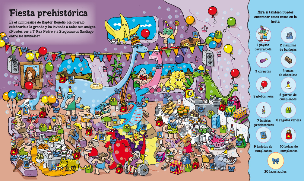 T-Rex Pedro y Stegosaurus Santiago disfrutan jugando con otros dinosaurios en Dinolandia. Únete a la diversión y compite en las carreras de reptiles; puedes ir de compras en el mercado jurásico y divertirte en la feria de los fósiles. Con mas de 1000 objetos de dinosaurios a buscar, desde mamuts lanudos, Triceratops o payasos cavernícolas hasta tablas de surf en forma de hueso. ¡Te encantará jugar en Dinolandia!