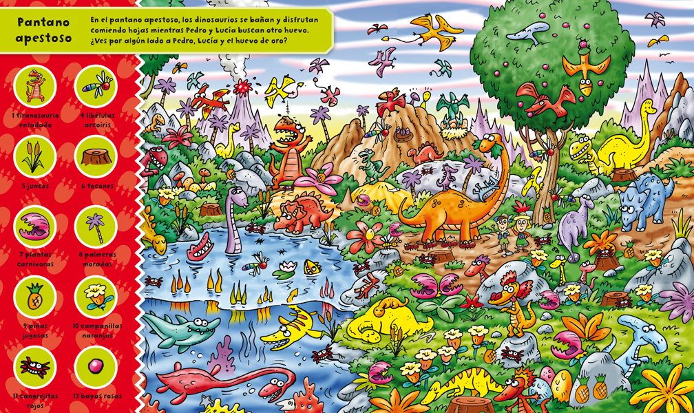 Viaja atrás en el tiempo y únete a los exploradores Pedro y Lucía en su búsqueda de huevos de oro en Dinolandia. Con más de mil objetos geniales que buscar, desde montones de monedas de oro hasta simpáticas arañas de cuatro ojos, este estupendo libro está lleno de entretenimiento y diversión.