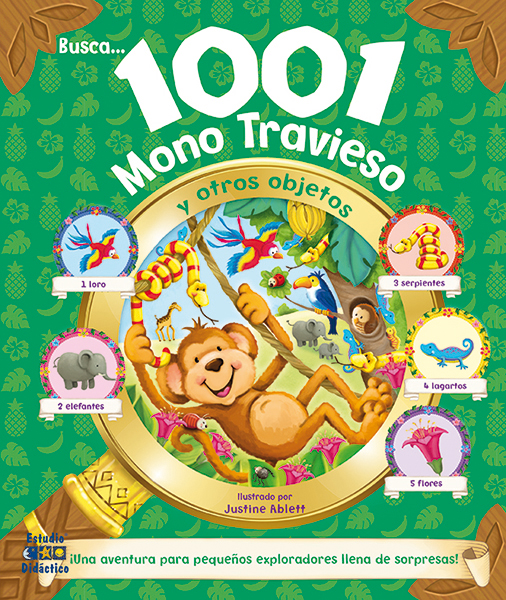 Explora la selva con este mono Travieso y sus amigos en esta fantástica aventura de busca y encuentra. Con más de 1000 objetos a descubrir en la selva, desde pelotas de playa, prismáticos, gusanos y arañas. Este hermoso libro está lleno de diversión y grandes hallazgos.