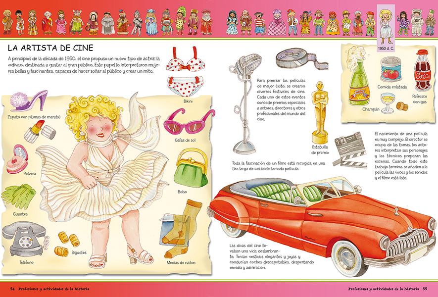 En el presente libro Profesiones y actividades de la historia, los niños aprenderán los diferentes oficios y actividades de la humanidad desde el cazador de mamuts pasando por el legionario romano, los aztecas y acabando con el astronauta y la chica punk.