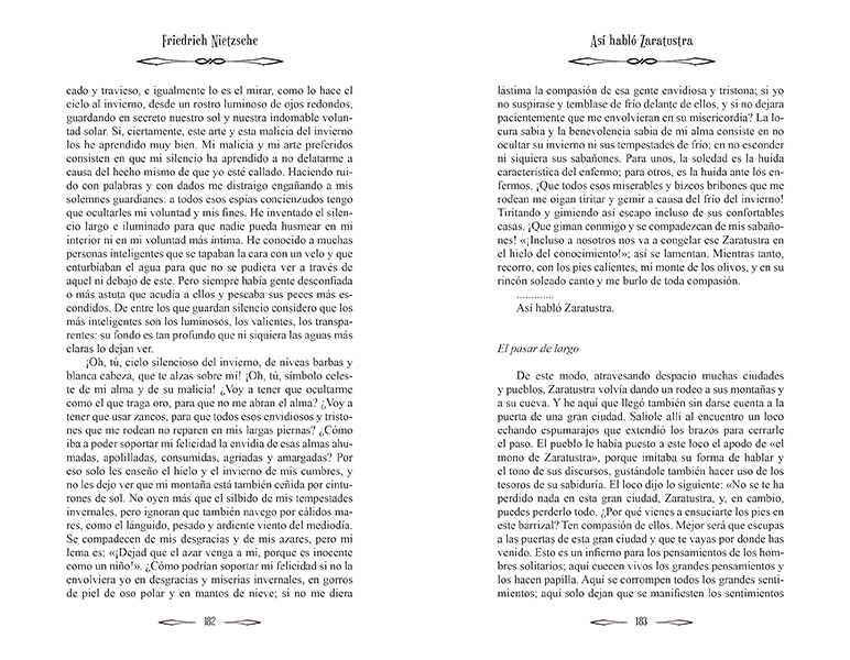 Así habló Zaratustra, de Friedrich Nietzsche, no solo está considerado como el libro más representativo de este genial pensador, sino también como una de las obras de mayor calidad literaria en lengua alemana de todos los tiempos. El anticristo constituye la más dura e implacable crítica jamás lanzada, no ya contra la «buena nueva» de Jesús, sino contra la manipulación que de la figura y del mensaje de este hizo, según Nietzsche, la Iglesia católica y, en concreto san Pablo. El autor expone lo que para él fue la actitud vital genuina de Cristo, y desenmascara la doctrina que, históricamente, le atribuyó un estamento sacerdotal movido por el odio, el rencor y el resentimiento.