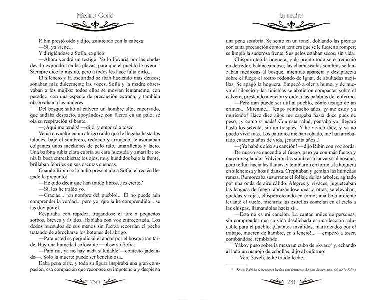 La madre es una de las novelas más conocidas y logradas de la literatura de todos los tiempos. En ella Gorki no se limitó a hacer una descripción localista de la miseria en que se veía sumido el proletariado urbano de su país, sino que compuso un canto al ansia humana de emancipación, por encima de las barreras levantadas por el miedo y la represión. Desarrollada en un estilo claro, directo, sin concesiones al detalle innecesarios, en el que los diálogos dramáticos priman sobre la descripción de ambientes, La madre está dotada de una extraordinaria capacidad para fomentar en el lector un ansia sin límites de libertad y de sed de justicia.