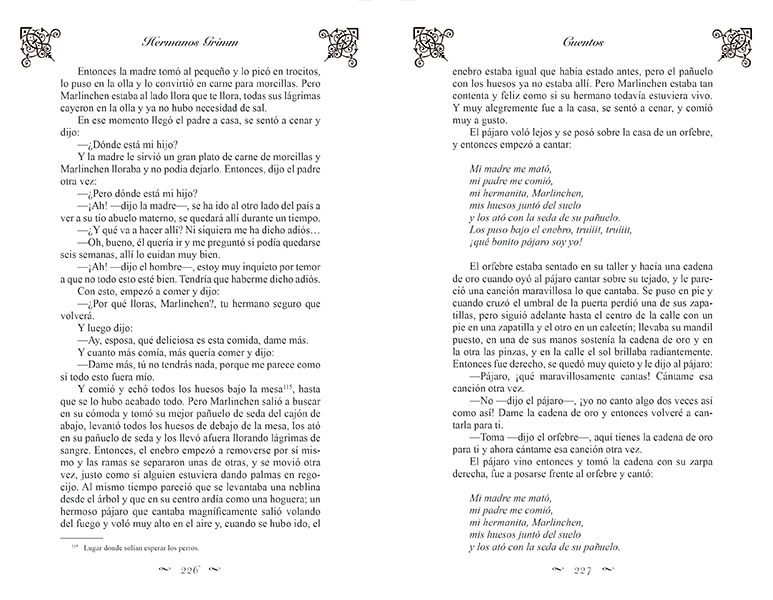 Hemos partido en esta selección de cuentos de Jacob y Wilhelm Grimm —más conocidos por su nombre conjunto de «Hermanos Grimm»— de la traducción histórica que realizó José Sánchez Biedma para la que fue la primera publicación de estos cuentos traducidos al castellano desde su original en alemán, que la casa Gaspar y Roig de Madrid publicó en 1867 con una selección de 46 de los ya muy famosos cuentos bajo el título Cuentos escogidos de los Hermanos Grimm.