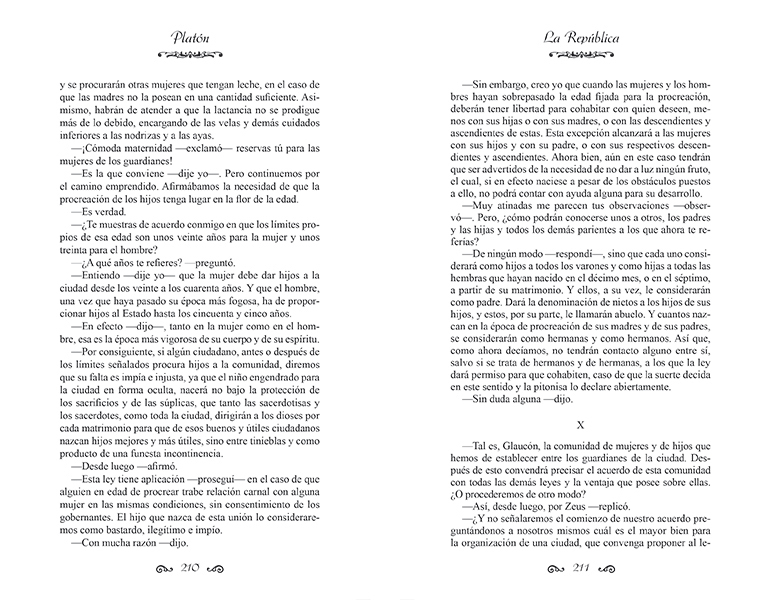 La República es la obra más conocida de Platón y es uno de los diálogos más importantes en donde expresa su concepción del arte, lo político, la sociedad, la justicia, la inmortalidad, la virtud, el bien y el mal. Se trata de un diálogo entre Sócrates y otros personajes. El propósito de Platón es el estudio de lo justo y de lo injusto, y la demostración de la necesidad moral, tanto para el Estado como para el individuo, de regir toda su conducta según la justicia; esto es, según la virtud, o precisamente más, según la idea del bien, principio de buen orden para las sociedades y para las almas. La obra está compuesta por diez libros.
