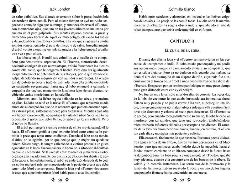 Colmillo Blanco narra la vida de un perro lobo llamado Colmillo Blanco y su relación con los seres humanos, especialmente con su dueño, en el territorio de Yukón, durante la fiebre del oro. Colmillo Blanco tiene que adaptarse a los diferentes ambientes en los que se encuentra, desde su nacimiento en la naturaleza salvaje hasta su vida como perro de pelea en un pueblo, y finalmente su transformación al ser domesticado por el hombre. A través de la historia de Colmillo Blanco, London explora temas como la crueldad, la redención y la relación entre el ser humano y el mundo animal. Colmillo Blanco es una de las obras más conocida de Jack London y ha sido adaptada en varias ocasiones para el cine y la televisión.