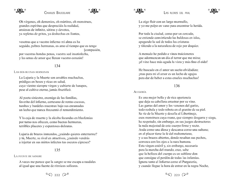 Hoy por hoy se coincide en considerar Las Flores del Mal como una de las fuentes vivas del movimiento poético contemporáneo. Carta magna de la «poesía maldita», esta obra produjo un fuerte impacto en la sociedad de su tiempo, hasta el punto de que fue condenada «por ultraje a la moral pública y a las buenas costumbres». Esta edición ha sido cuidadosamente prologada por Enrique López Castellón, catedrático de la Universidad Autónoma de Madrid.