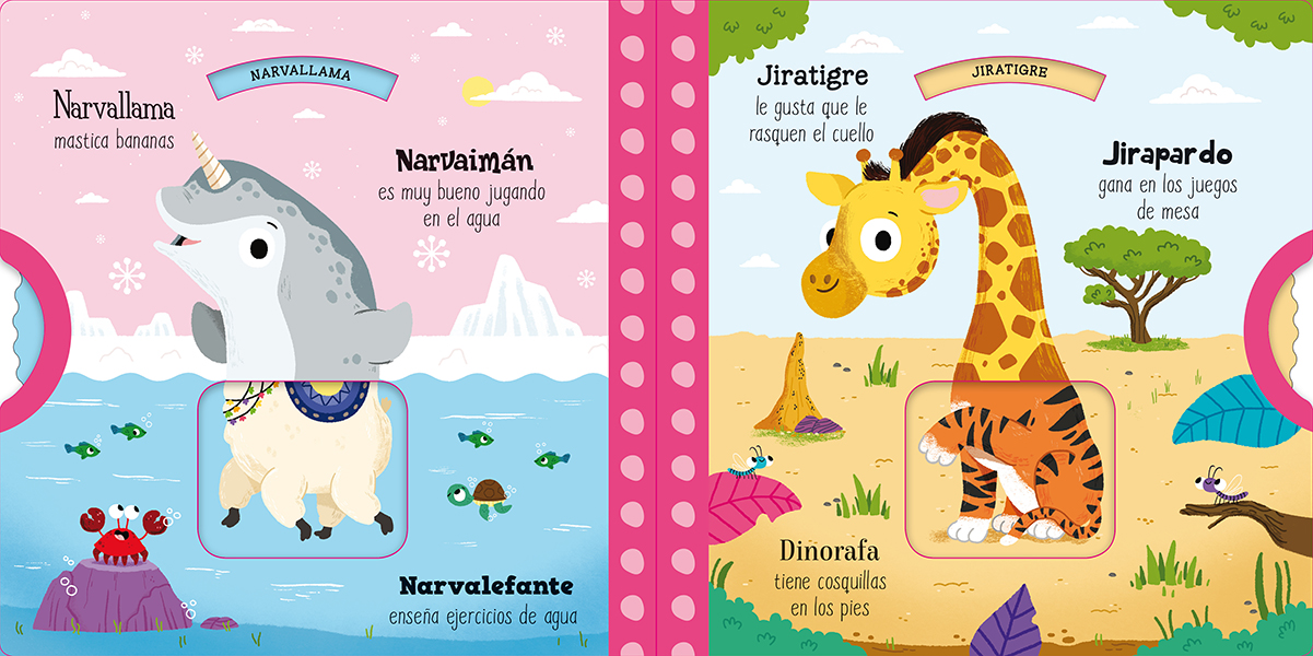 Gira la rueda para mezclar y combinar tus animales favoritos. Con más de 25 originales combinaciones. ¿Elegirás una Narvallama o un Narvalefante? ¡La decisión es solo tuya!