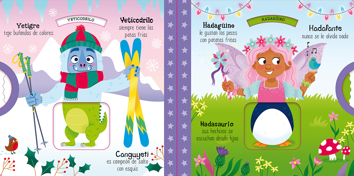 Gira la rueda para mezclar y combinar tus criaturas mágicas favoritas. Con más de 25 originales combinaciones. ¿Elegirás un Tetigre o un Yeticodrilo? ¡La decisión es solo tuya!