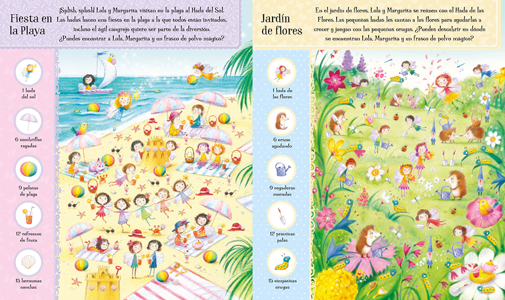 ¡Toma tu varita y prepárate para una mágica aventura en el País de las Hadas! La gran Reina de las Hadas ha perdido su magia y pide a las Hadas Lola y Margarita que la encuentren. ¿Puedes ayudarlas? Con más de mil objetos mágicos que buscar, este hermoso libro está lleno de diversión y grandes hallazgos.