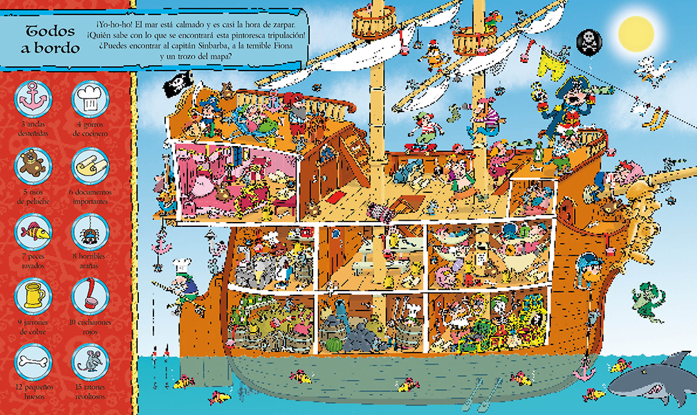 ¡Yo-ho-ho! Toma tu brújula dorada y prepárate para zarpar en una alucinante aventura de piratas. El capitán Sinbarba y su equipo están buscando el tesoro perdido y necesitan de tu ayuda. Con más de mil objetos de piratas que buscar, este fantástico libro está lleno de misterio y diversión.